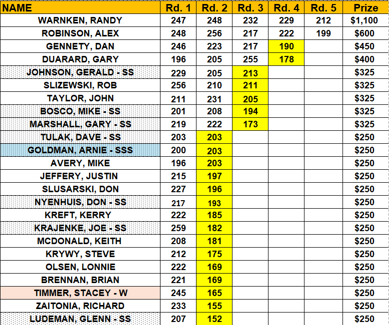 The cut to make the top 32 was 1286 (Rob Slizewski). Our extras out of the cut to move on in the elimination rounds: In the Senior Division (50+): John Taylor (1283); In the Super Senior division (60+) Gerald Johnson (1281), Don Nyenhuis (1276), Larry Salvati (1249), Jim DePlanche (1243), and Darrin Greene (1243); In the super-super senior division (70+) Tony Stipcak (1266) and Arnie Goldman (1248); In the women’s division was Teri White (1276) and Sandy Schultz (1160).