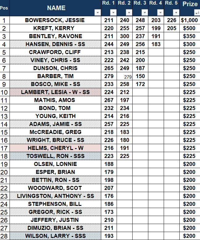 The cut to make the top 20 was 1344 (Greg McCreadie & Bill Stephenson). Our extras out of the cut to move on in the elimination rounds: In the senior division (50+) Justin Jeffery (1326); In the Super Senior division (60+) Rick Gregor (1334), Bruce Wright (1325), and Brian Dimuzio (1289); In the super-super senior division (70+) Ron Toswell (1307) and Larry Wilson (1287); In the women’s division was Cheryl Helms (1321).