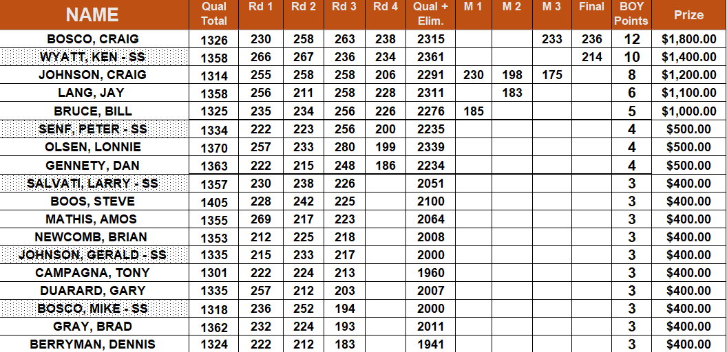 With the 2nd place finish, Wyatt received 10 Bowler of the Year points, which pulled him into a tie with Hall of Famer Mike Calvin, both accumulating 44 points during the year. This is the first year Bowler of the Year will be shared. There haven’t been very many Bowler of the Year winners in the SSO history not named Gerald Johnson, Gerald leads the way with an amazing 9 awards, Wyatt now with 4, Larry Walker 1 and Mike Calvin 1.