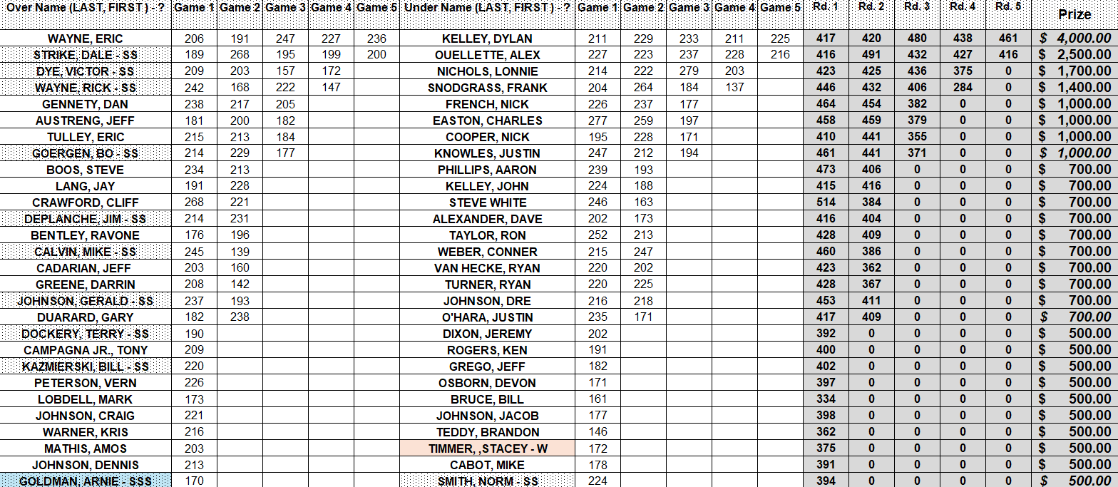 We had 93 teams vying for the title at Westland Bowl. Scoring was tough during the qualifying rounds, as the Over 50 bowlers averaged 192.52 and the Under 50 bowlers averaged 200.63. Steve Boos and Aaron Phillips led qualifying with an impressive score of 2688, while the cut to make the 28-team elimination round was 2439 – this number was shot by Wayne and Kelley who looked like they were heading home after 5 games, however, Wayne, who struggled all day, shot 279 in game 6 while Kelley grinded to a 200 game, which propelled them to the final spot.